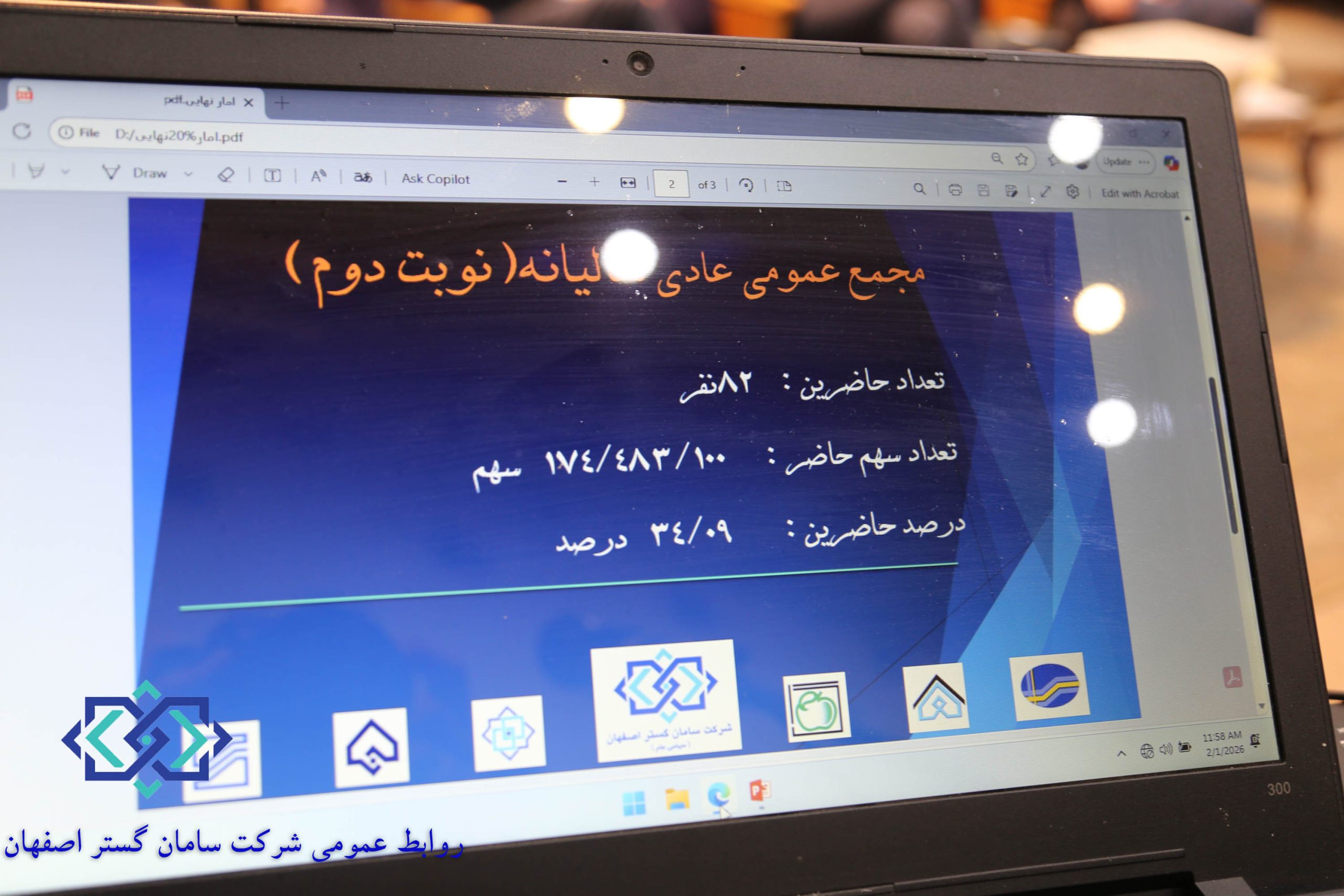 به گزارش روابط عمومی ، مجمع عمومی عادی سالانه (نوبت دوم) 1404 شرکت سامان گستر اصفهان روز یکشنبه مورخ 12 بهمن ماه از ساعت 10 صبح در سالن همایش کتابخانه مرکزی شهردای اصفهان با حضور اعضای هیئت مدیره، نماینده بازرس قانونی و حسابرس مستقل شرکت، همچنین حضور نماینده سازمان بورس اوراق بهادار به صورت برخط و سهامداران حقوقی و حقیقی با مشارکت 34/09درصدی سهامداران برگزار شد.